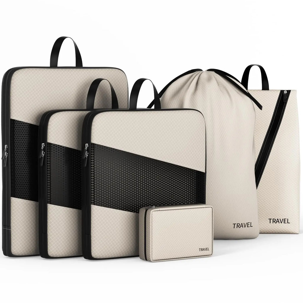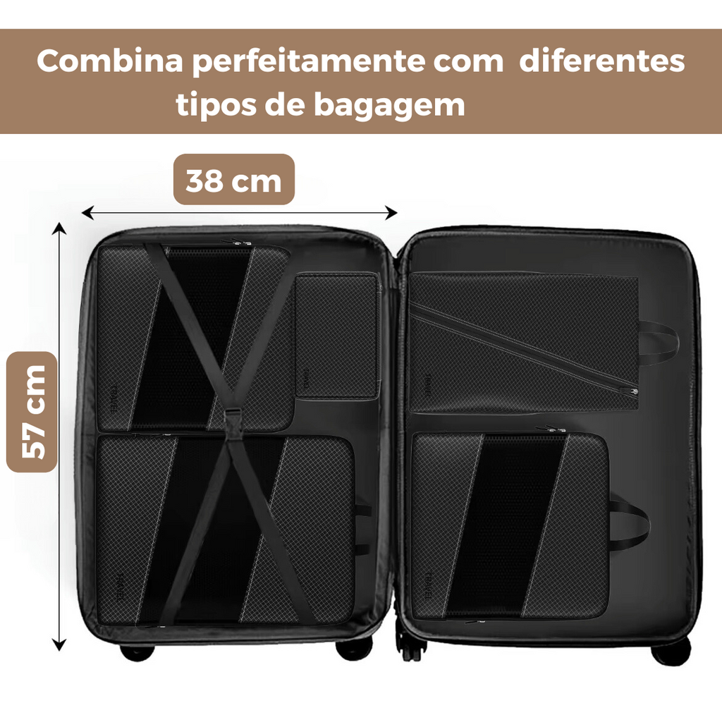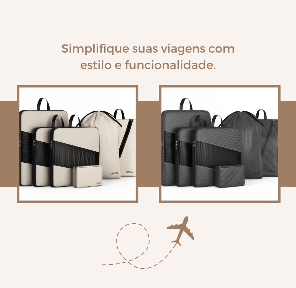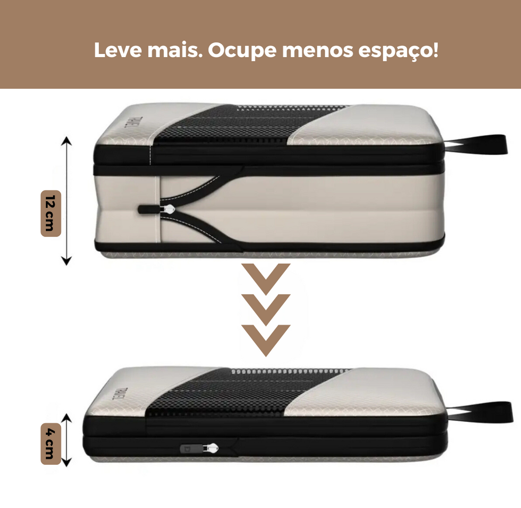 As bolsas possuem um design que permite compactar os itens, reduzindo seu volume e otimizando o espaço em sua mala.