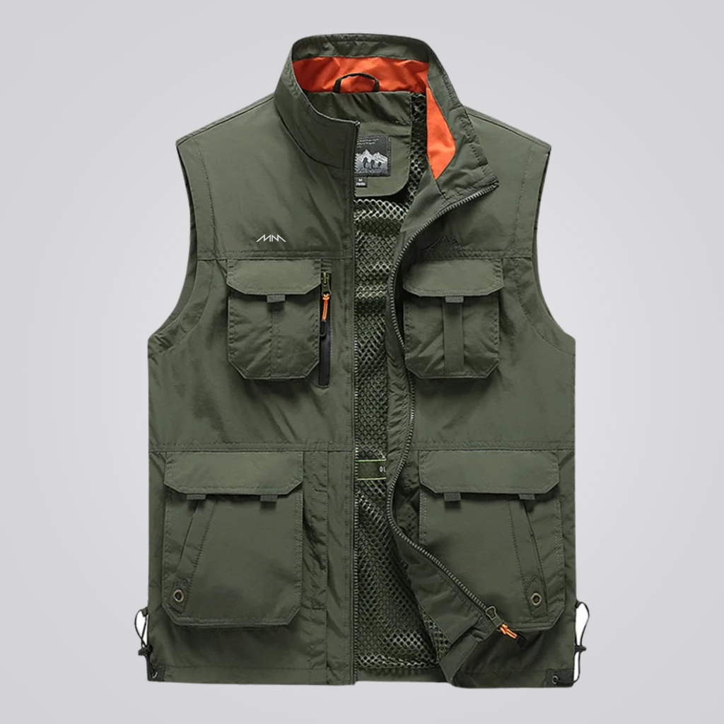 - Seis Bolsos Frontais Funcionais: Seis bolsos frontais práticos permitem armazenamento seguro e organizado de itens essenciais, como equipamentos de pesca, câmeras e acessórios de trilha.